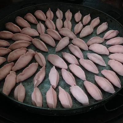 重点说说我爱吃的芋头饺吧,把它含在嘴里时滑溜溜的,如同泥鳅。选用粉粉软糯、有粘性的芋头,和番薯粉一起揉成面团,然后再包肉馅。煮好的芋饺吃起来既糯又柔,滑溜可口。