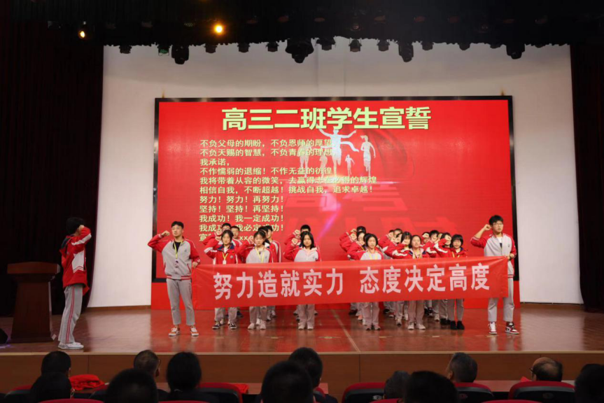 各班学生分别宣誓 高三年级的四个班级逐一上台,为全体师生展现本班的风采。“同闯峥嵘十春秋,共创辉煌佳年华”“努力造就实力,态度决定高度”“贵在坚持、难在坚持、成在坚持”,听啊,这就是高三学子的声音,更是高三学子面对高考大关的无尽信心。