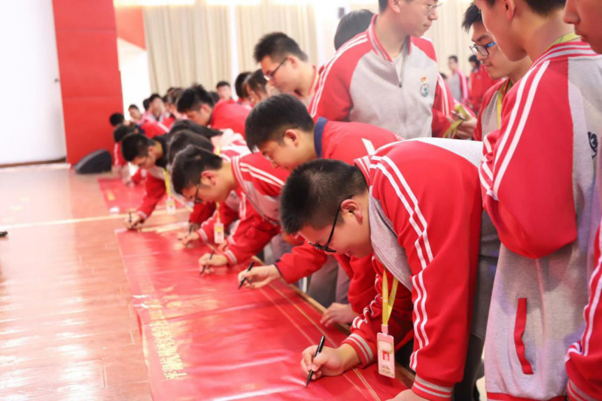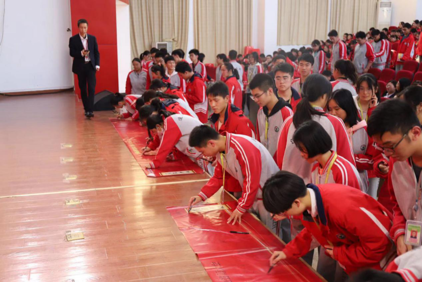各班学生分别到台前签名,表达自己的雄心壮志,坚持砥砺前行。一个个形各异却志相同的名字仿佛在无声地宣告同学们必定将努力落实在行动上的决心。