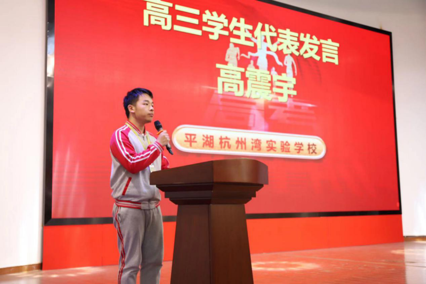 高三一班的高震宇同学作为优秀学生代表,为所有高三学生喊出壮志豪言,表达高考必胜的信念。