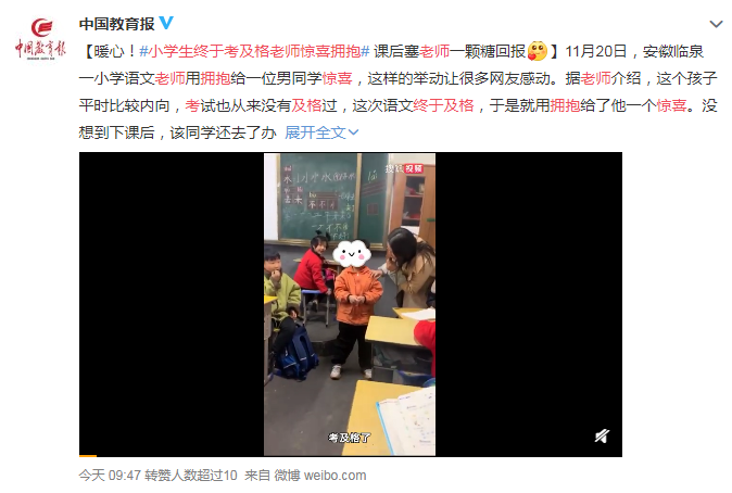 据老师介绍,这个孩子平时比较内向,考试也从来没有及格过,这次语文终于及格了,于是就用拥抱给孩子一个惊喜。没想到下课后,孩子还去了办公室,送给于老师一颗糖。
