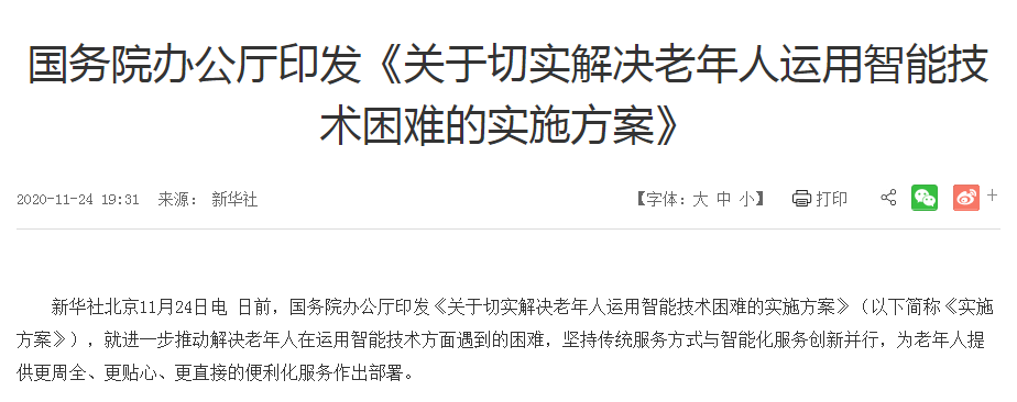 11月24日,国务院办公厅印发了《关于切实解决老年人运用智能技术困难实施方案》的通知,要求各类日常生活场景中,必须保留老年人熟悉的传统服务方式。