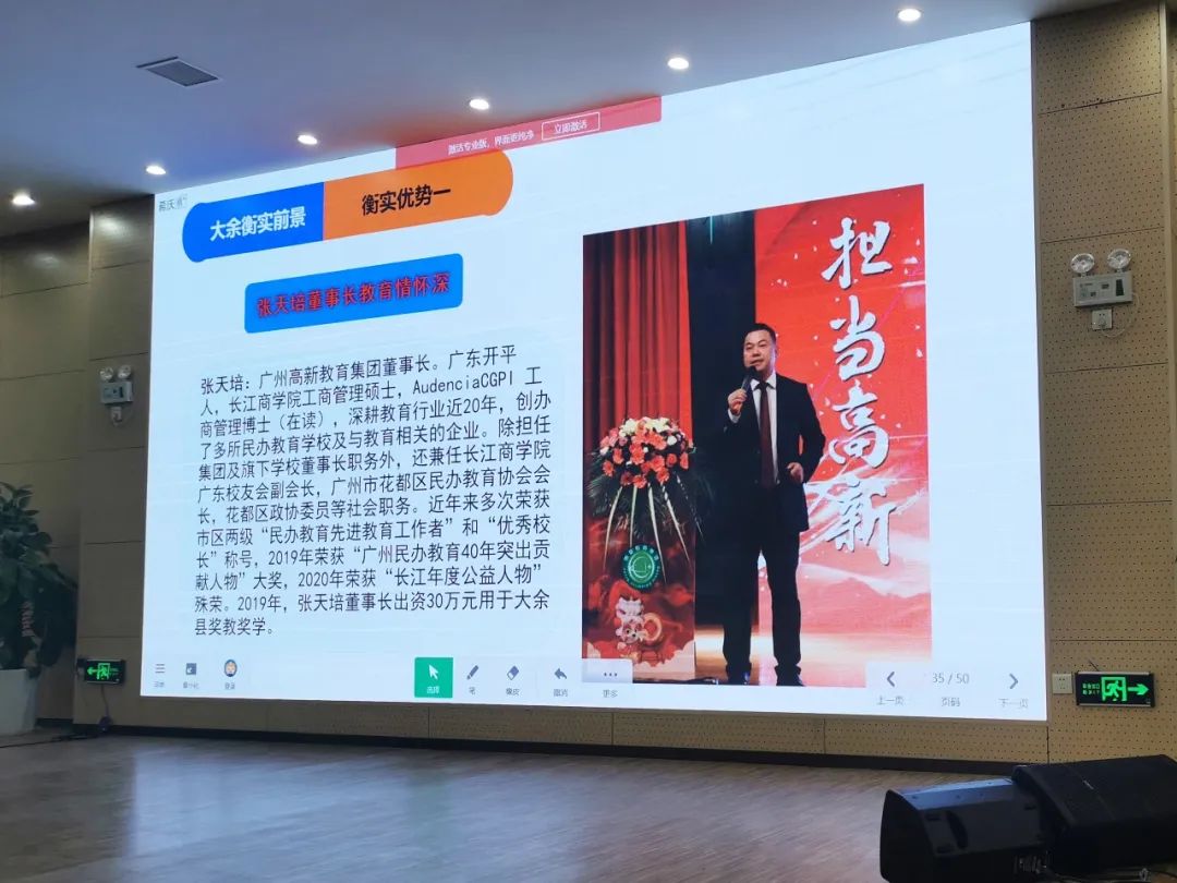 接着,曾局长以近三年大余教育的辉煌成绩为例,简析大余民办教育的光明前景。曾局长指出,大力发展民办教育是十分重要的,民办教育不仅有利于积蓄社会教育资源,满足人民群众对优质教育的强烈渴望,且机制灵活、适应市场、讲求实效,能够有效地促进教育供给的多样化。更重要的是,大余衡实有着强大的教育实力背景,具有七大独有的优势: