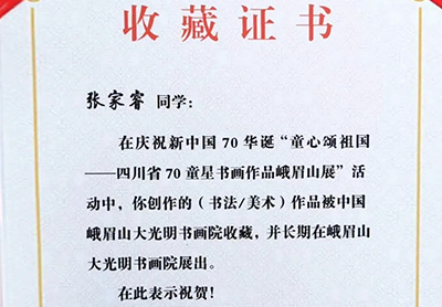 衡川学子张家睿美术作品《爱我九州》入选由中国美术家协会、中国民族文化艺术基金会共同主办的“...